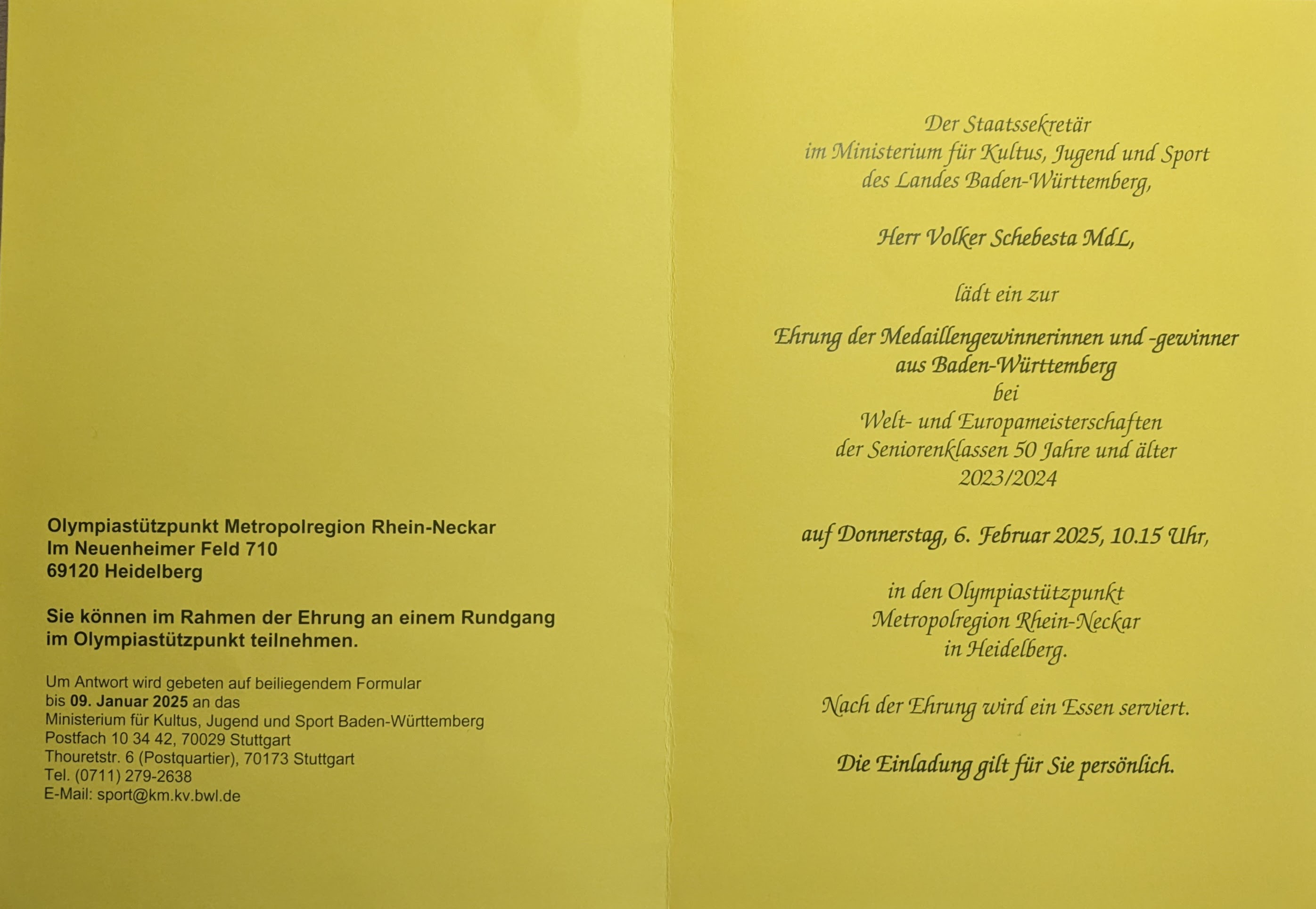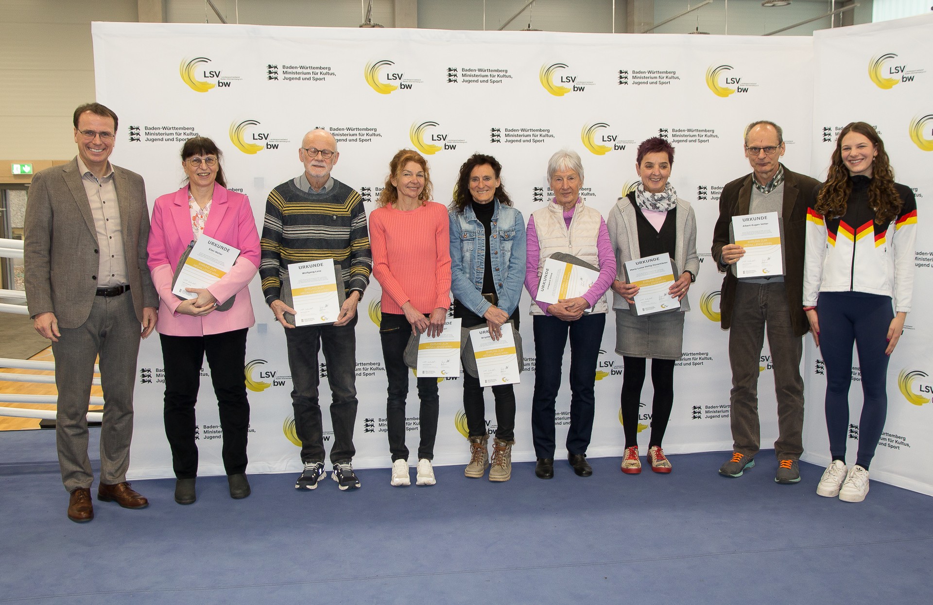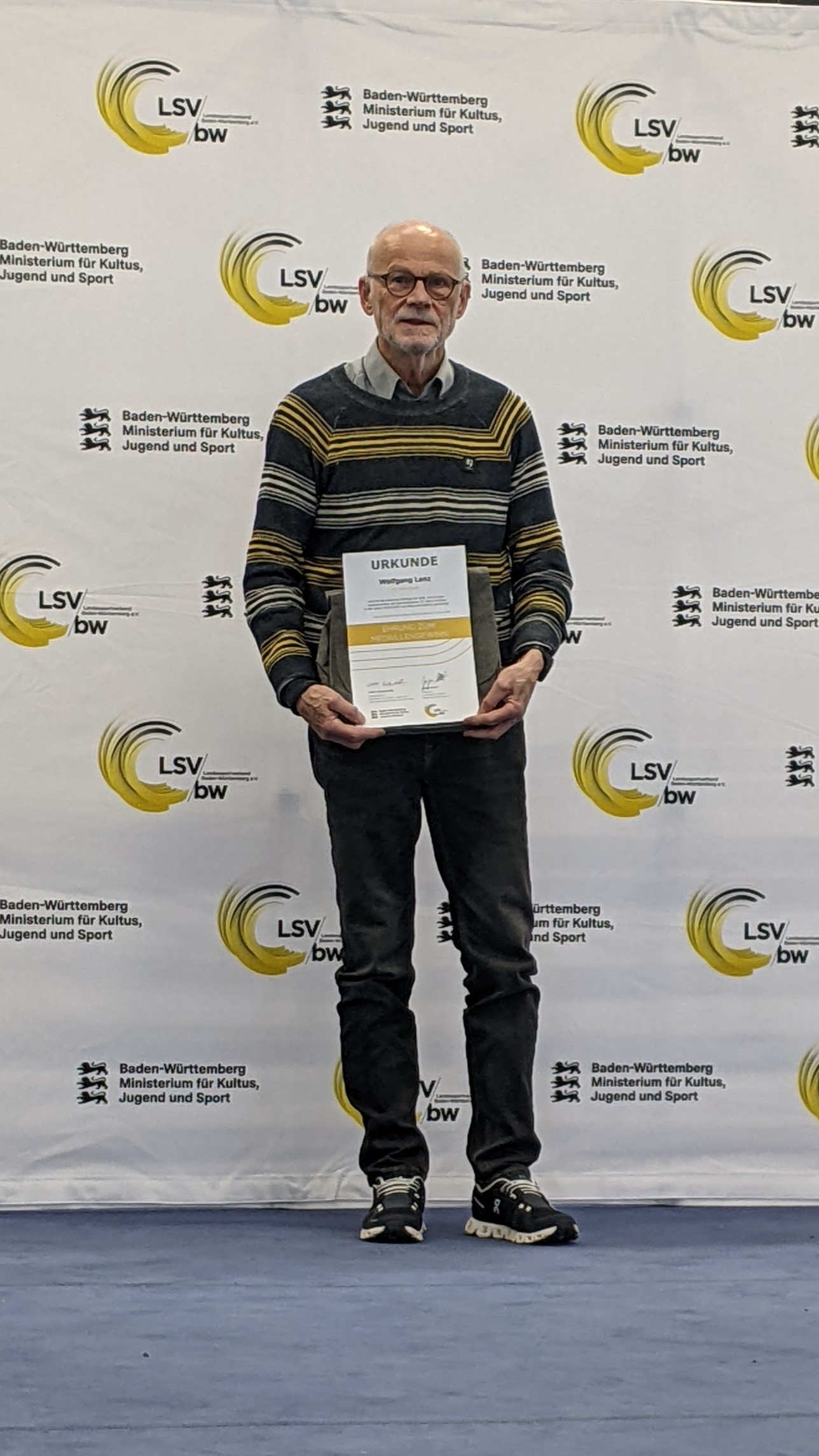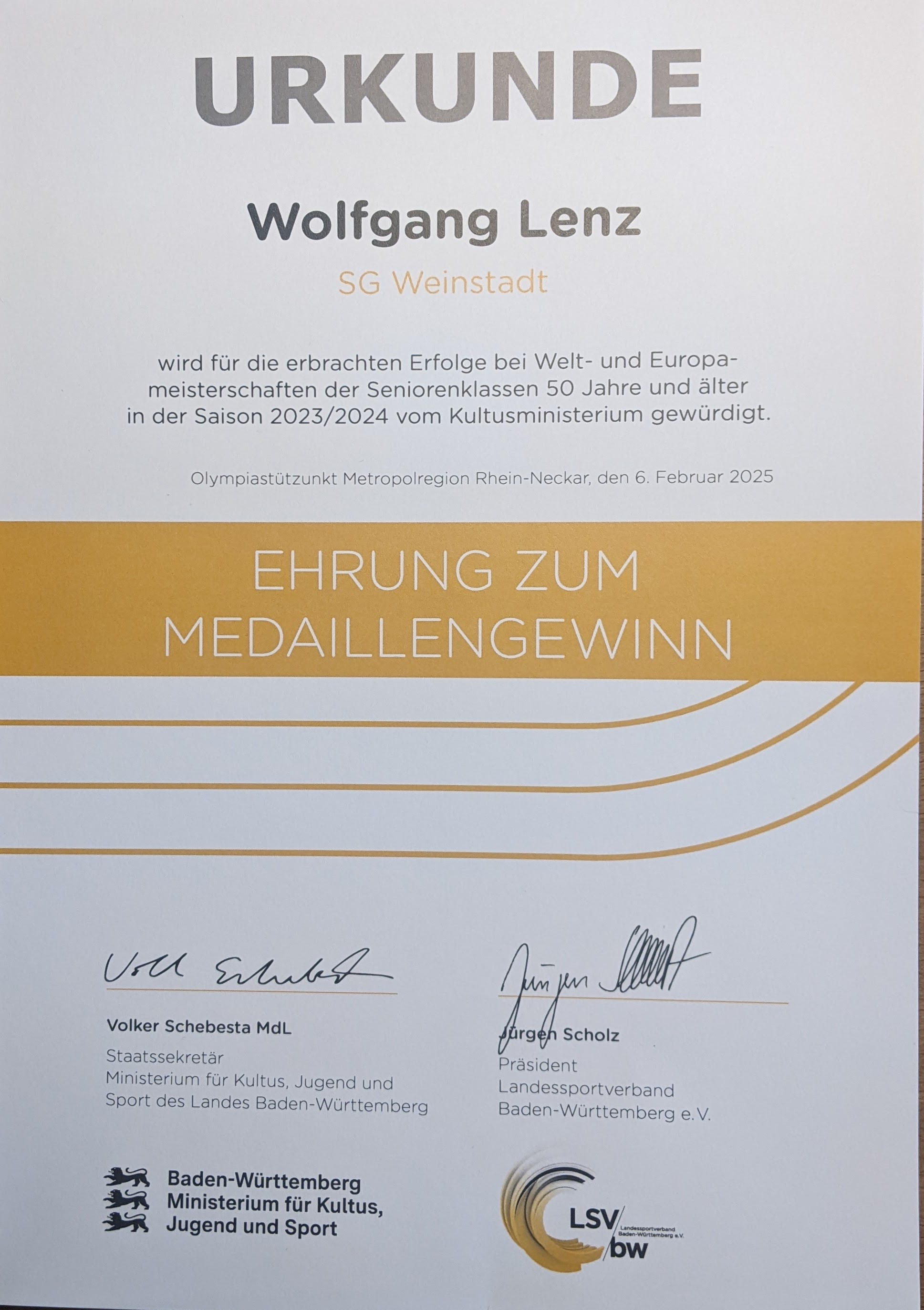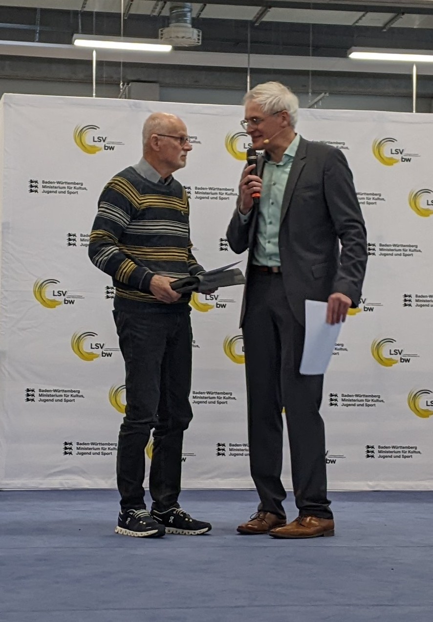 Auf Einladung des Ministeriums für Kultus, Jugend und Sport ging es für den Weinstädter Wolfgang Lenz zum Olympiastützpunkt Metropolregion Rhein-Neckar nach Heidelberg. Dort wurde der überaus erfolgreiche Seniorensportler der SG Weinstadt für seine tolle Leistung über die 3000 Meter bei den 14. Masters Hallen-Europameisterschaften in Toruń/Polen im vergangenen Jahr mit Gewinn der Bronzemedaille in der Altersklasse M75 zusammen mit den anderen Medaillengewinnerinnen und –gewinnern aus Baden-Württemberg bei Welt- und Europameisterschaften der Seniorenklassen 50 Jahre und älter für die Saison 2023/2024 ausgezeichnet.
