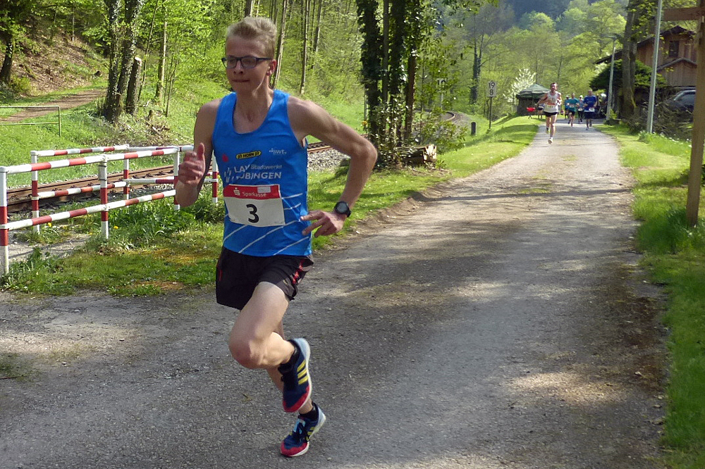Vom Start weg drückte der Vorjahresdritte Levin Maurer auf das Tempo. Er lag fast das gesamte Rennen 20 bis 30 Meter vor Tim Weber (SV Oberkollbach, der anfangs noch von Stefan Buder (Tempomacher Ludwigsburg) begleitet wurde. Eine sechsköpfige Verfolgergruppe wurde von dem Jugendlichen Vinzens Erath (nicht im Ziel) angeführt. Sie bestand aus Daniel Kirchenbauer (SV Oberkollbach/7. in 35:28/1. M35), Sebastian Groteloh (TSV Hirschau), Viktor Luft (SV Rotfelden/4. in 34:52/2. M40), Guido Schmid (TSV Wildbad/6. in 34:59/1. M45) und Armin Gotsch (VfL Ostelsheim/10. in 37:26/3. M45). Levin Maurer konnte gegen Ende des Rennens seinen Vorsprung vergrößern und siegte mit 34:06 deutlich. Weil er aber 2 Runden vor Schluss sein Trikot ausgezogen hatte, gab es noch eine Verwarnung von Seiten des Veranstalters. Ein solcher Regelverstoß hat in der Vergangenheit schon mehrfach zur Disqualifikation geführt. Sebastian Groteloh überlief nicht nur Stefan Buder (5. in 34:58), er konnte sogar dank seines legendären Endspurts noch Tim Weber (3. in 34:37/1. M30) kurz vor dem Ziel abfangen und Rang 2 in 34:34 (1. M45) belegen.