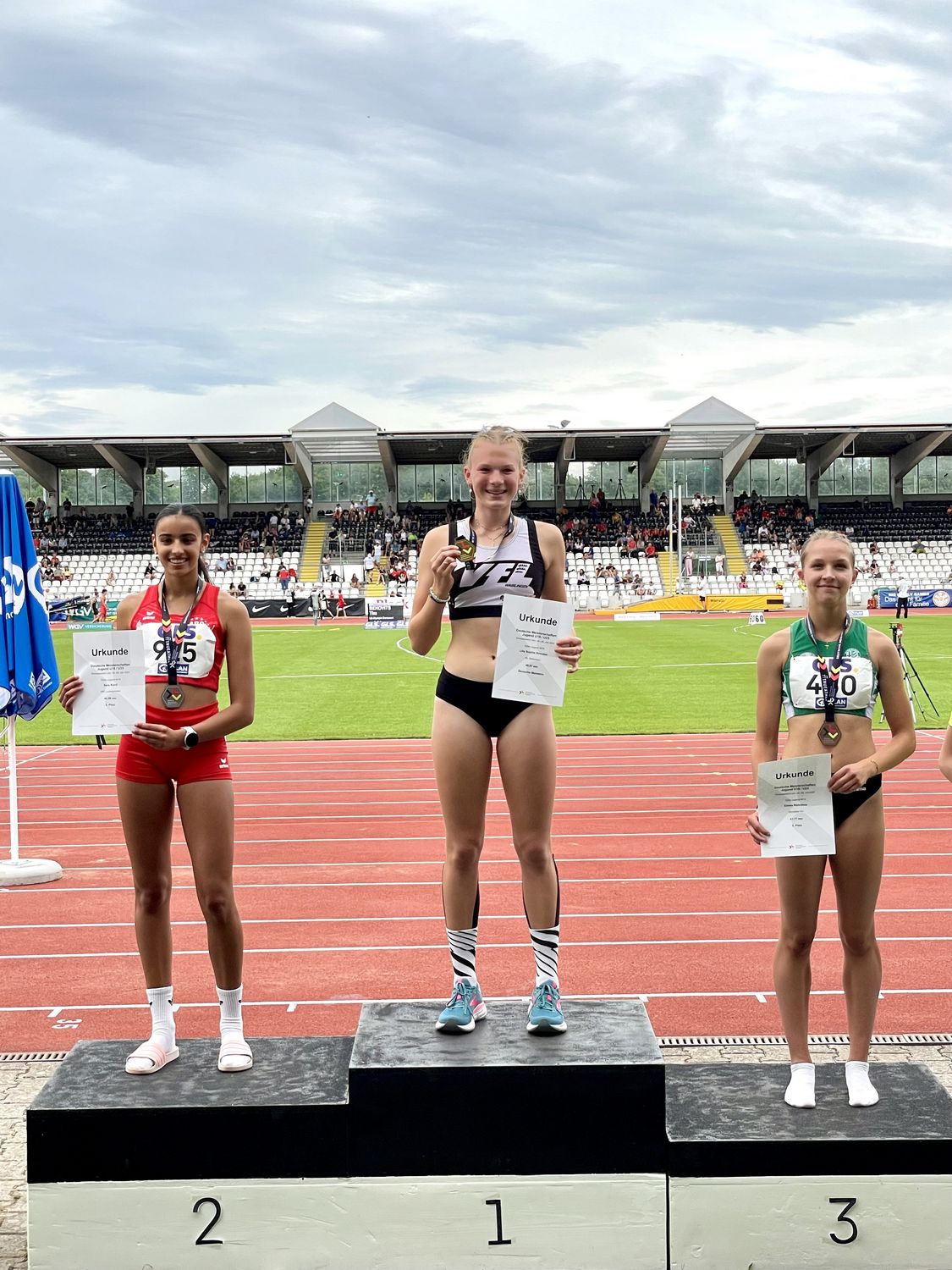 Für einen weiteren goldenen Moment sorgte Nina Ndubuisi von der SG Schorndorf im Kugelstoßen der U23. Mit 16,61 Metern holte sie sich souverän den Titel. Nach einem durchwachsenen Start mit einem ungültigen Versuch steigerte sie sich im Verlauf des Wettbewerbs deutlich, erzielte im vierten Durchgang die Siegerweite und bestätigte diese im fünften Versuch mit 16,52 Metern – ein eindrucksvoller Auftritt der Schorndorfer Athletin. Zuvor hatte sich Ndubuisi bereits im Diskuswurf der U23 eine Bronzemedaille gesichert. Mit einer Weite von 51,63 Metern landete sie hinter Katja Seng (Eintracht Frankfurt, 52,74 m) und Lea Bork (LV 90 Erzgebirge, 51,92 m) auf Rang drei. Ihre Serie beinhaltete neben dem weitesten Wurf einen weiteren Versuch jenseits der 51-Meter-Marke – ein konstant starker Auftritt, der ihr die verdiente Podestplatzierung einbrachte.